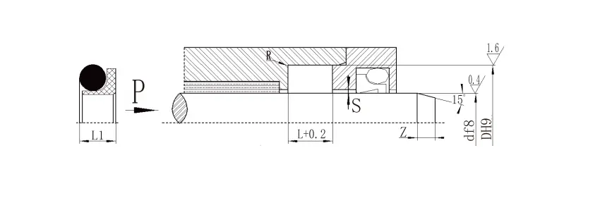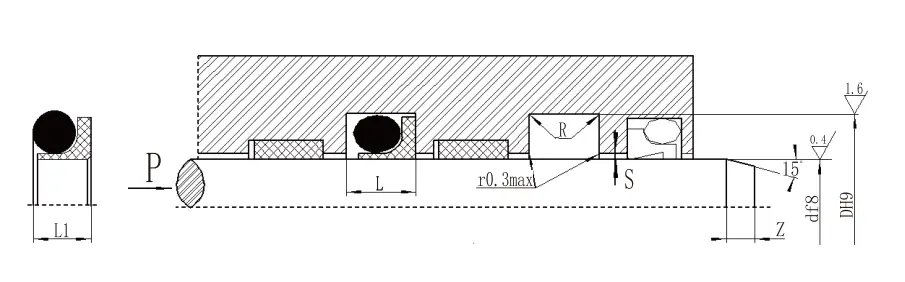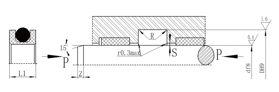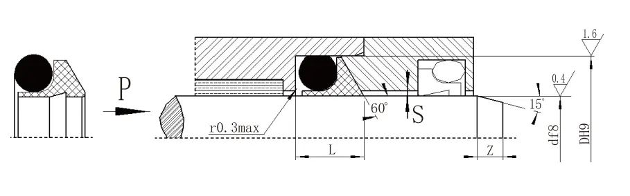 | 2. Para a instalação de vedações de ranhura integral (fechada), consulte o guia de instalação da nossa empresa. 3. Para pressão> 40MPa, a área radicular do selo usa tolerância de ajuste H8/F8. | ||||||||||