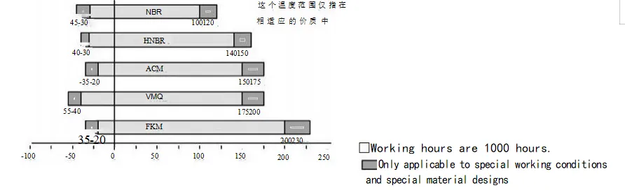 Existem dezenas de fatores que afetam o efeito de vedação. Além do próprio retentor de óleo, como seu material e estrutura, outros fatores como meio, temperatura, pressão, lubrificação, velocidade e rugosidade superficial também afetam diretamente o efeito de vedação, e esses fatores frequentemente interagem entre si. Os gráficos a seguir são apenas para referência do usuário.